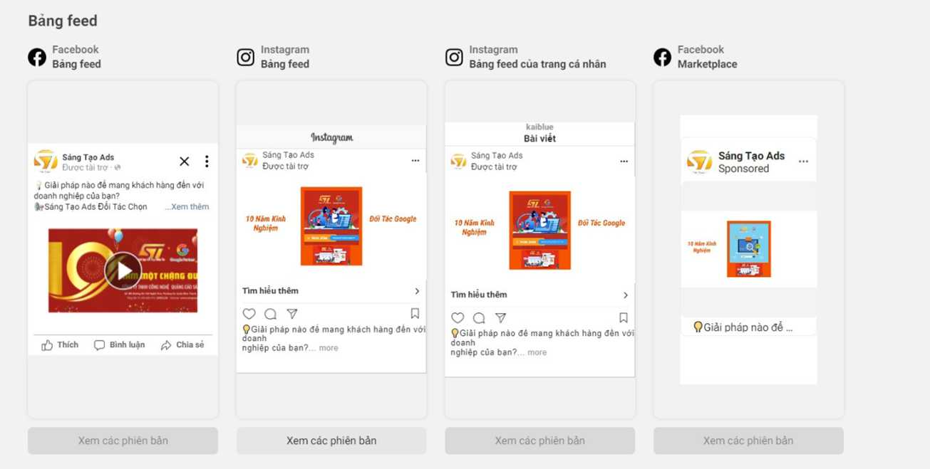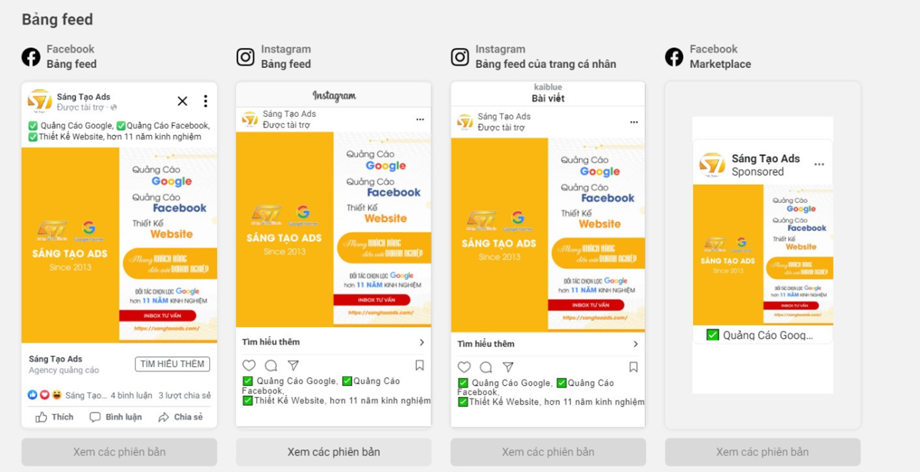 Hình minh họa quảng cáo hiển thị trên bảng feed, bảng feed instagram, Marketplace Facebook, bảng feed video Facebook.