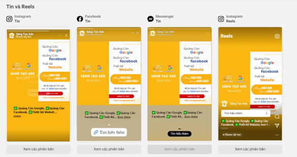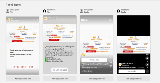 Minh họa quảng cáo hiển thị ở Tin Instagram, Tin Facebook, Reels Instagram, Tin messenger