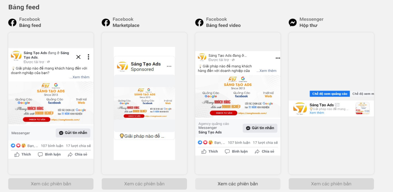 Hình minh họa quảng cáo hiển thị trên bảng feed facebook, bảng feed video Facebook , Facebook Marketplace, hộp thư messenger.