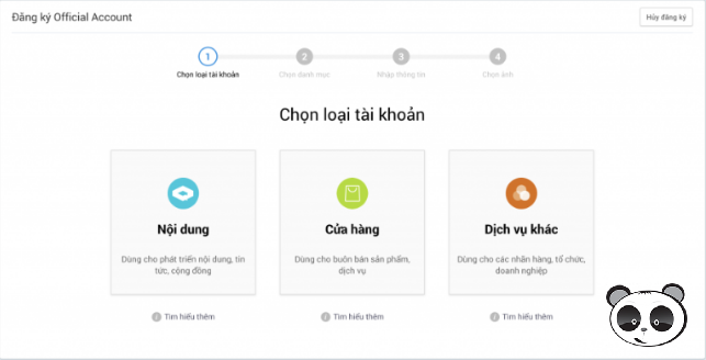 Để đăng ký Official Account bạn cần chọn loại tài khoản như hình dưới đây. Dưới mỗi loại tài khoản lại có đoạn miêu tả ngắn mục đích sử dụng của từng loại tài khoản khác nhau. Bạn hãy cân nhắc chọn đúng loại tài khoản, bởi mỗi loại lại có những ưu thế riêng khác biệt nhau.